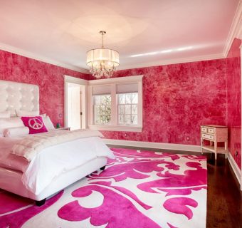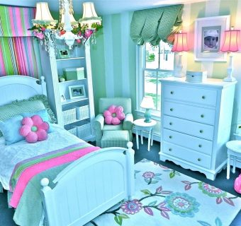 The combination of bold colors on a teenager’s room makes this room feel excited, tropical theme room with a pink blanket pattern that has a small round gives a feminine touch in this room. Bright pink color combined with purple and yellow flowers showed that this room is for adolescent girls.